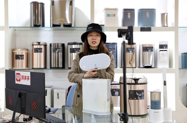 ▲在潔安惠的產(chǎn)品樣品間,主播正在介紹他們?yōu)槠炊喽嘤脩舳ㄖ频囊豢罹邆銲PX5級(jí)別防水功能的垃圾桶。(攝影:小南)